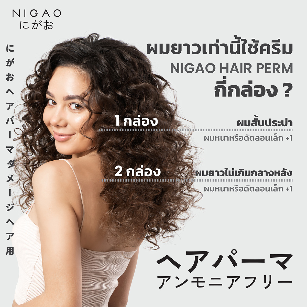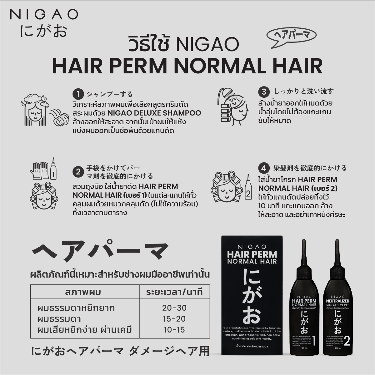 - กรณีผมเสียอ่อนแอใช้ นิกาโอะ แฮร์ ทรีทเม้นท์ การ์เดียน ชโลมบนผมก่อนลงน้ำยาดัด (ไม่ต้องล้างออก)