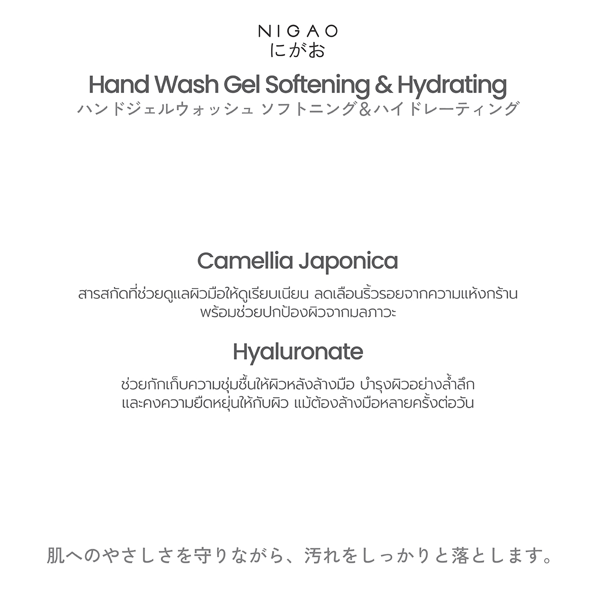 เจลล้างมือสูตรอ่อนโยน ช่วยให้ผิวรู้สึกชุ่มชื้นและนุ่มนวล ด้วยสารสกัดจากดอก Camellia Japonica ที่ช่วยให้ผิวดูเรียบเนียน Hyaluronate เติมความชุ่มชื้น ให้ผิวดูสดใส สุขภาพดีทุกวัน
